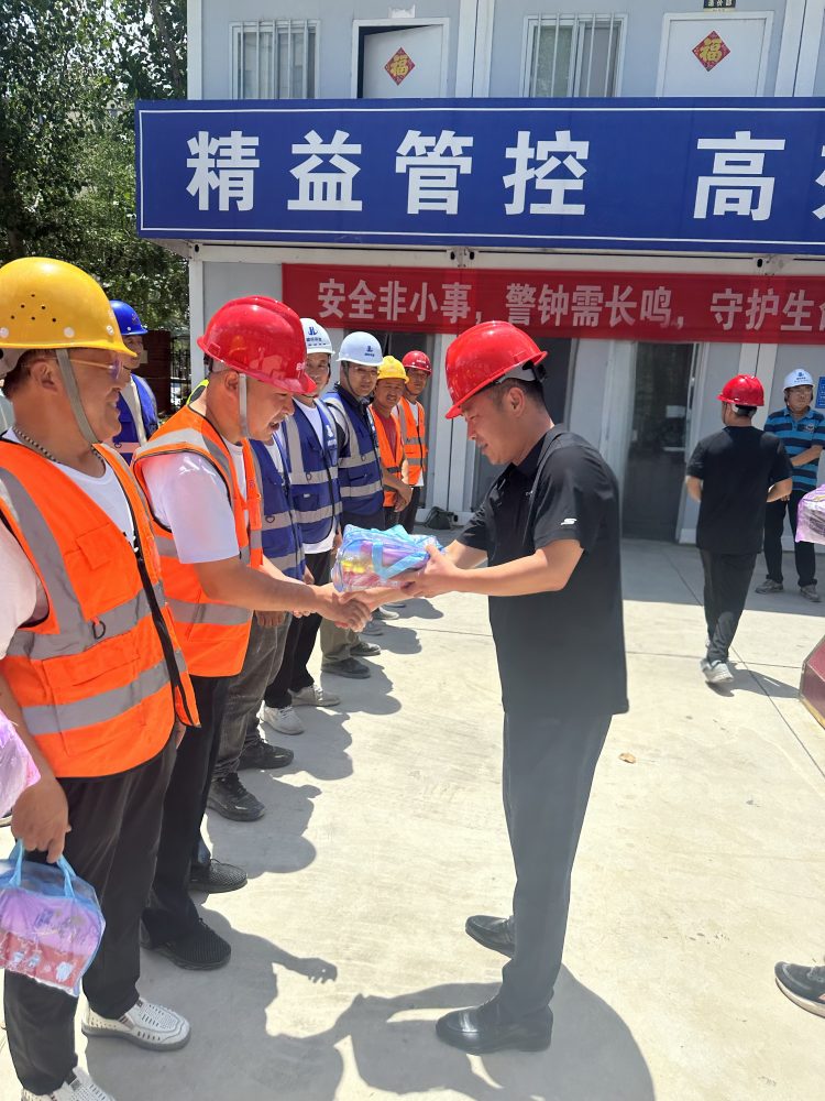 在項(xiàng)目現(xiàn)場(chǎng),趙焱將防暑降溫物資送到一線施工人員手中,對(duì)他們?cè)诟邷丨h(huán)境下堅(jiān)守崗位、辛勤付出表示感謝,同時(shí)叮囑大家要注意防暑降溫,確保自身安全與健康。
