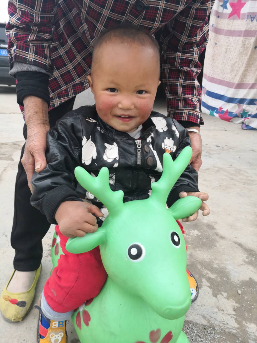 孩子收到玩具露出了開(kāi)心的笑容。